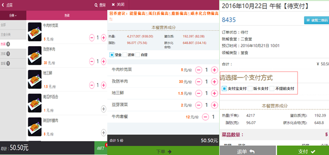 就餐者通過(guò)手機(jī)app、微信、網(wǎng)頁(yè)進(jìn)行在線訂餐,選餐后可以直接在線支付餐費(fèi),在線支付通道支持微信錢包、支付寶、網(wǎng)銀支付等。運(yùn)用食堂訂餐系統(tǒng),讓就餐者訂餐、支付更靈活。