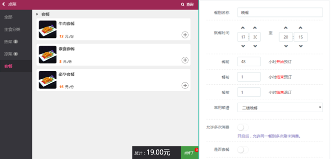 系統(tǒng)支持多種食堂餐飲模式,包括套餐模式,自助餐模式,菜品單點(diǎn)模式等,滿足企業(yè)食堂多樣化餐飲模式的需求。