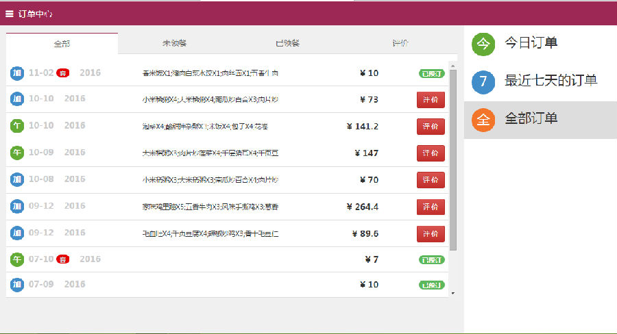 還可以查詢就餐者的訂餐,包括今日訂餐、最近七天訂餐及全部訂單,還可以點擊評價,進行飯菜的口味、食堂服務等信息的評價,食堂根據就餐者評價對菜品及服務進行改進。