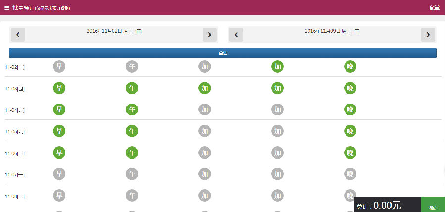 智慧食堂管理系統(tǒng)網頁預訂端可以進行批量預訂,就餐者可以根據食堂發(fā)布的菜譜,選擇要預訂的時間,進行餐別的預訂。