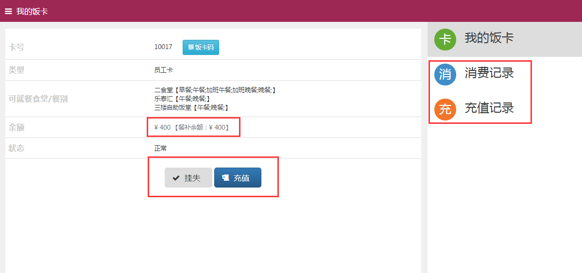 還有最后一個,也是對于就餐者來說最方便快捷的功能了,那就是在線充值飯卡、在線掛失,可以通過微信、支付寶進行在線飯卡充值,無需再到專門的窗口去充值了,掛失也是一樣的,飯卡丟失了,可以第一時間進行掛失,減少經濟損失。