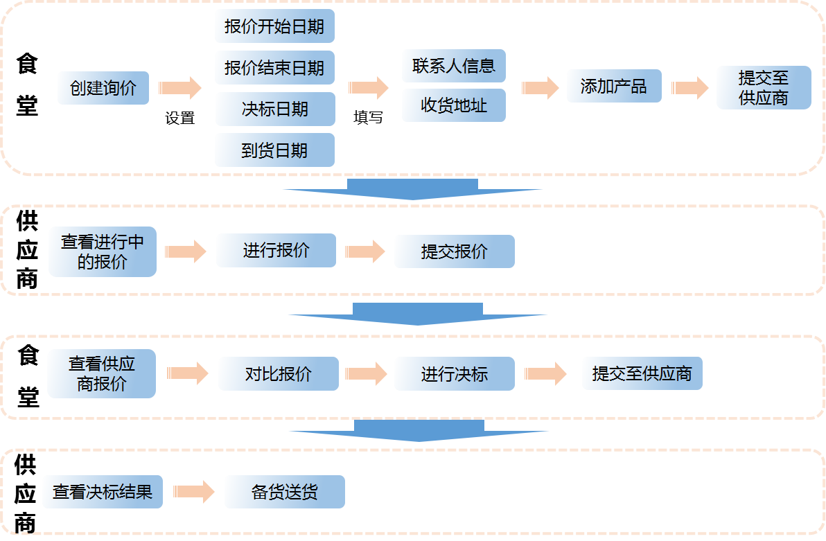 智慧食堂管理系統(tǒng)的供應(yīng)商的詢(xún)比價(jià)功能,食堂可通過(guò)系統(tǒng)發(fā)布詢(xún)比價(jià)來(lái)選擇供應(yīng)商,既提高采購(gòu)工作效率又能使其公開(kāi)透明便于監(jiān)管。食堂采購(gòu)管理員登錄滿(mǎn)客寶智慧食堂管理系統(tǒng),創(chuàng)建詢(xún)比價(jià),選擇本次詢(xún)價(jià)的原料、數(shù)量,可邀請(qǐng)供應(yīng)商報(bào)價(jià)。詢(xún)比價(jià)可以設(shè)定報(bào)價(jià)開(kāi)始、結(jié)束時(shí)間和詢(xún)比價(jià)決標(biāo)時(shí)間,可以設(shè)定是否允許供應(yīng)商多次報(bào)價(jià)等,供應(yīng)商登錄滿(mǎn)客寶智慧食堂管理系統(tǒng),可以查看進(jìn)行中的詢(xún)價(jià)等相關(guān)信息,然后進(jìn)行報(bào)價(jià),根據(jù)采購(gòu)員的設(shè)置可以進(jìn)行多次報(bào)價(jià)或只有一次報(bào)價(jià)機(jī)會(huì),以截止日期報(bào)價(jià)為準(zhǔn)。報(bào)價(jià)時(shí)間截止后,食堂查看供應(yīng)商的報(bào)價(jià)并進(jìn)行決標(biāo),決標(biāo)結(jié)束后,供應(yīng)商登錄系統(tǒng)查看是否中標(biāo)。
