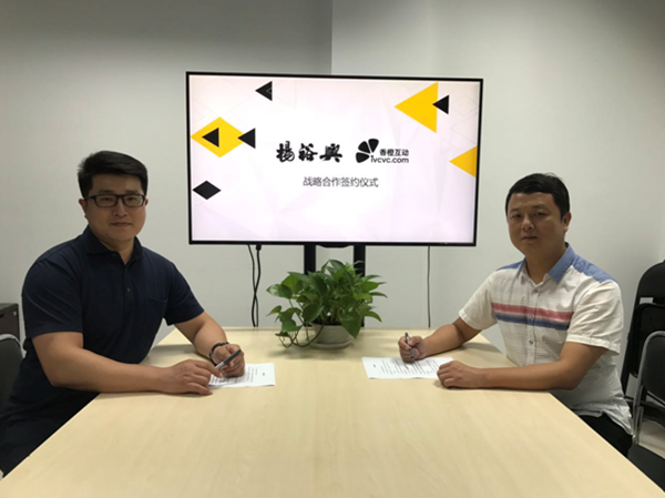 香橙互動(dòng)與長沙楊裕興餐飲有限公司簽署戰(zhàn)略合作協(xié)議(左香橙互動(dòng)聯(lián)合創(chuàng)始人艾揚(yáng)、右楊裕興總經(jīng)理周總)