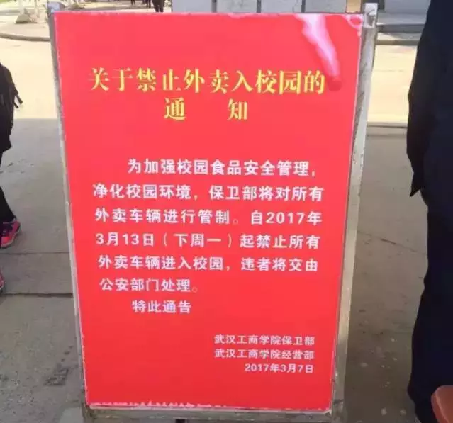 2017年5月,據(jù)都市時報報道,記者走訪昆明12所高校得知,有10所高校禁止外賣車輛進入校園。2016年7月以來,在高校云集的武漢地區(qū),華中科技大學(xué)、華中農(nóng)業(yè)大學(xué)、武漢理工大學(xué)、武漢體育學(xué)院等高校,最近都紛紛劃立了“禁區(qū)”——限制外賣車輛進入公寓區(qū)。