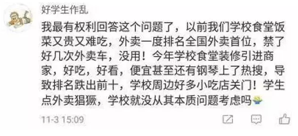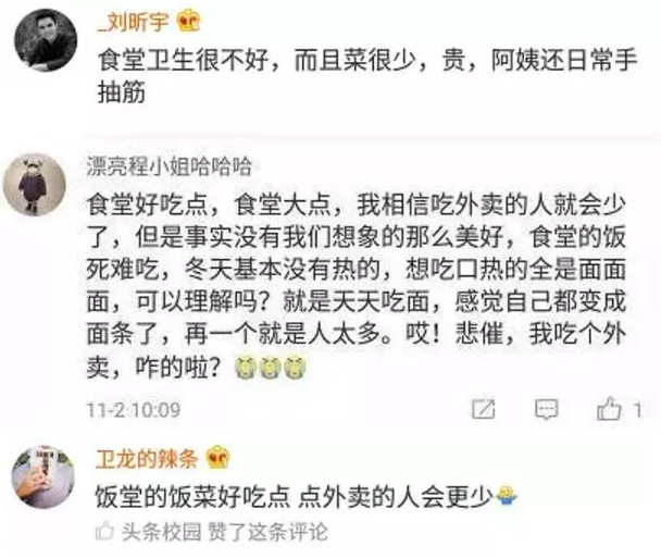 對于學(xué)校的外賣禁令,不少同學(xué)在網(wǎng)上發(fā)表了自己的觀點,有人認為選擇叫外賣也是迫不得已: