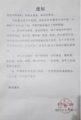 江西南昌理工學(xué)院對全校學(xué)生、校內(nèi)所有食堂和食品經(jīng)營店下發(fā)了一則通知,自9月22日起,要求校內(nèi)所有食堂及食品經(jīng)營店,一律不得提供和使用一次性餐具、塑料袋等,并嚴(yán)禁外賣進校。