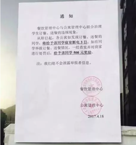2017年4月18日,一則落款為大連財經(jīng)學(xué)院后勤集團的通知,引起該校學(xué)生熱議。通知中寫到:從即日起,各公寓如發(fā)現(xiàn)訂餐、送餐的同學(xué),將給予該同學(xué)寢室斷電3日;如有同學(xué)舉報訂餐、送餐情況,一經(jīng)查實并對商家進行處罰后,給予該同學(xué)500元獎勵。