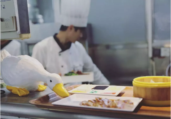 要說(shuō)名氣,七食堂大概是緊隨二食堂之后的。一進(jìn)門對(duì)著的地方就是烤鴨檔口,柜臺(tái)上還擺著鴨子公仔,簡(jiǎn)直可愛。