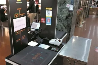 結(jié)算機類似于超市柜臺,柜臺旁豎起一塊指示牌,清晰標(biāo)注了支付流程,柜臺面板上則標(biāo)出了兩個結(jié)算區(qū),結(jié)算區(qū)上方則分別安裝一條桿狀掃碼器。