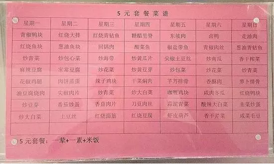 菜單周一至周日每天更新且不重樣,給學生提供多樣化的選擇。工作人員會將每天的固定菜單貼在食堂的門口,方便同學提前了解當天菜品。