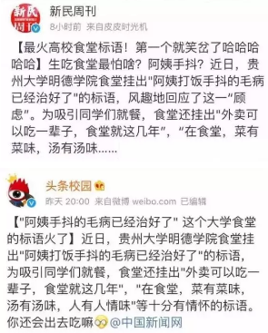 貼心而富有情懷的標(biāo)語、有趣而生動的溫馨提示,讓普通的食堂變得不再普通。能讓那么多同學(xué)無比留戀、懷念,離不開的是食堂經(jīng)營者以及工作人員的用心經(jīng)營。