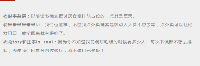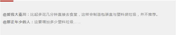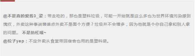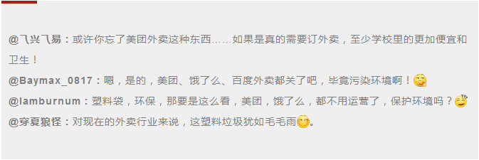 還有網(wǎng)友提醒道,別忘了還有“美團(tuán)百度餓了么”,食堂外賣產(chǎn)生的“塑料垃圾猶如毛毛雨”,至少吃學(xué)校里外賣更加便宜和衛(wèi)生!