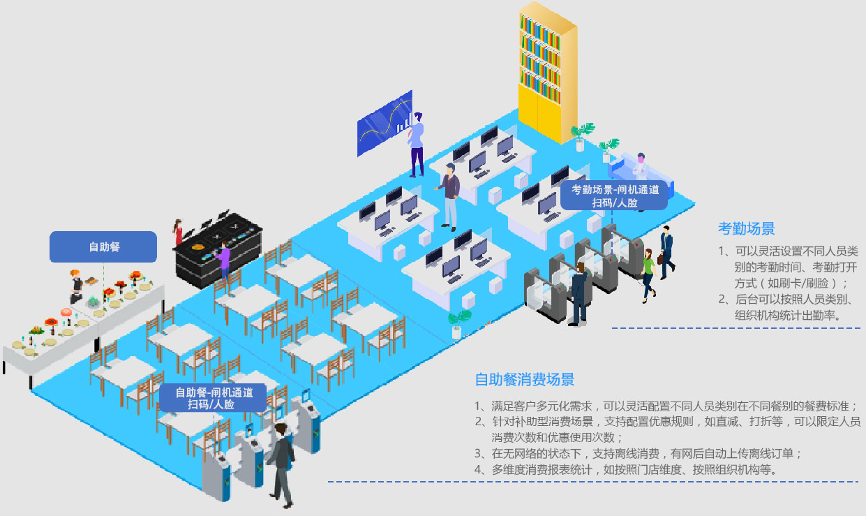 自助餐消費(fèi)場(chǎng)景滿足客戶多元化需求,可靈活配置不同人員在不同餐別的餐費(fèi)標(biāo)準(zhǔn)、設(shè)置優(yōu)惠規(guī)則、限定人員消費(fèi)次數(shù)和優(yōu)惠使用次數(shù)、支持離線消費(fèi)、多維度統(tǒng)計(jì)消費(fèi)報(bào)表。