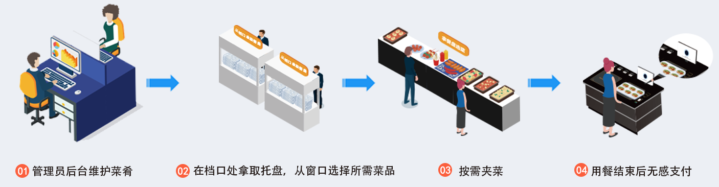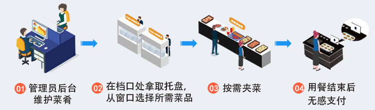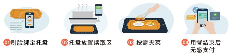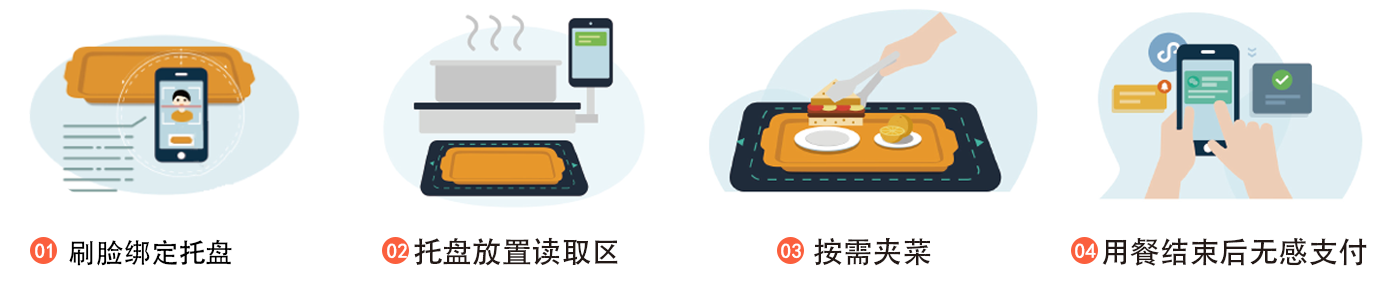 食堂將制作好的菜品,盛放到帶有芯片的餐具中,通過定價(jià)終端掃描定價(jià)后放入選餐區(qū),就餐者可以自由選取菜品放入托盤內(nèi),結(jié)算臺(tái)將自動(dòng)識(shí)別菜品信息、營養(yǎng)成分及價(jià)格,并自動(dòng)核算出整單價(jià)格,就餐者直接通過刷臉/掃碼/刷卡的方式完成支付。